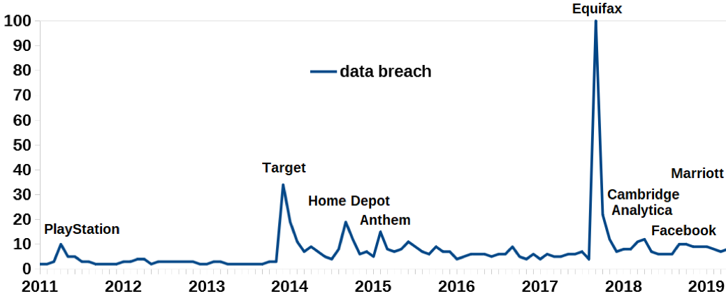 The December 2013 Target breach is a distant second, followed by the 2014 Home Depot breach and the 2015 Anthem breach. The 2018 Facebook-Cambridge Analytica scandal also coincides with a small uptick, as does the 2011 Playstation hack. It is interesting that the impact of other prominent breaches including the October 2018 Facebook breach and especially the massive Marriott/Starwood breach of the same year seems negligible.