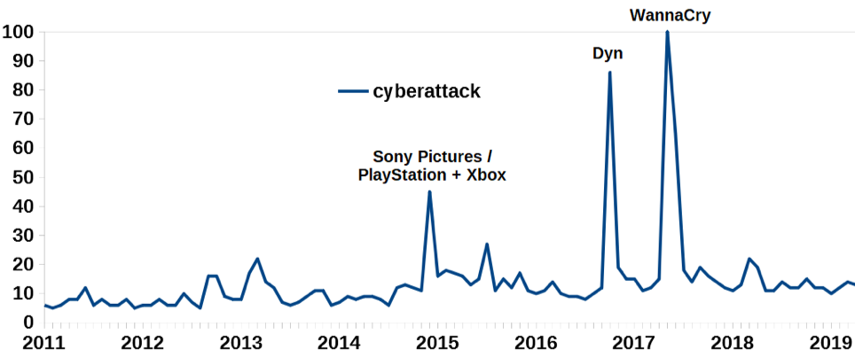 So what about cyberattacks? Well, based on the search interest, the 2017 global WannaCry ransomware attack wins the title of most interesting cyberattack, although it was a close race with the 2016 distributed denial-of-service (DDoS) attack on domain name system (DNS) firm Dyn, which caused major Internet disruptions across the US and Europe.
