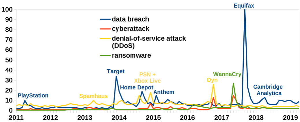 The data suggests that people cared far more about Equifax than they did about Dyn and WannaCry. The Target breach also ranks higher than any cyberattack. In addition to the incidents mentioned before, the DDoS results expose a few smaller attacks including another PSN/Xbox Live attack that occurred in August 2014 and the 2013 Spamhaus attack that broke the record of biggest DDoS attack ever, with the flood of traffic reaching 300 Gbps at its peak. For the record, this is almost 6 times smaller than the current record from March 2018, which stands at 1.7 Tbps. The fact that the biggest DDoS attack to date does not show up on the graph probably has to do with the fact that it did not cause a significant outage and didn’t receive much attention from mainstream media outlets.