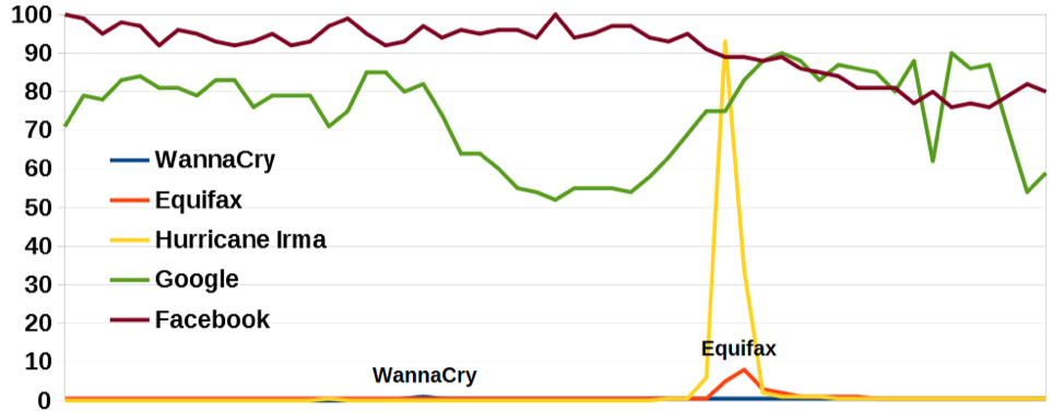 It is not difficult to identify the Equifax breach among the top search terms, which is an indication of the significance of this breach. There is even a minuscule bump for WannaCry, although this would be easy to overlook.