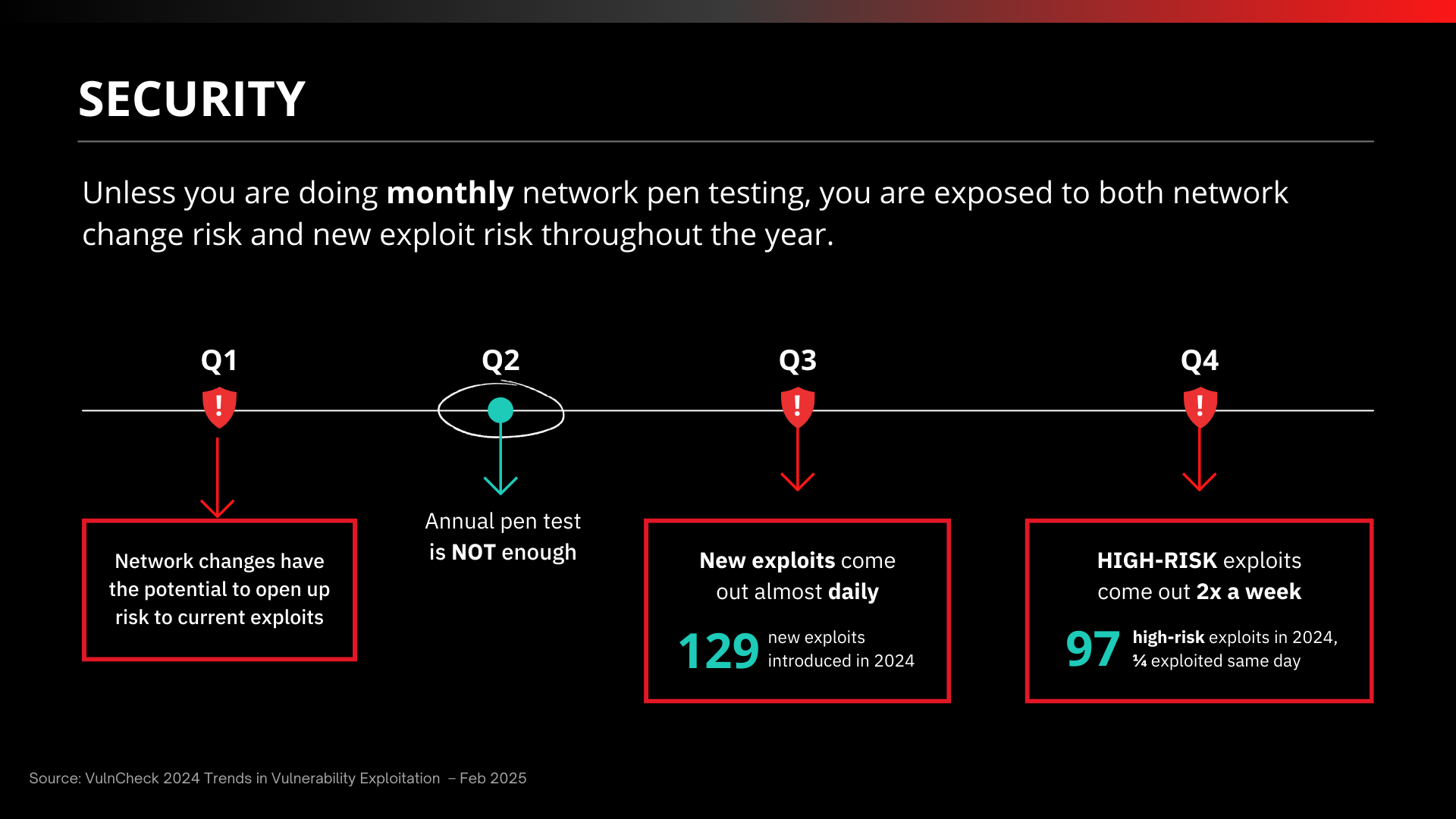 This is where continuous network pentesting becomes the new standard. Testing frequently, and often automatically, ensures that defenses are validated throughout the year instead of just once. Without it, organizations are relying on guesswork in between long testing cycles.