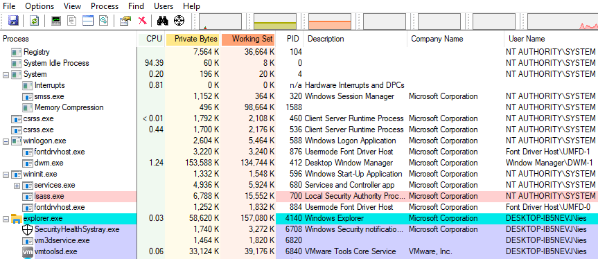 Processcolumn, and check the value in theUser Namecolumn.NT AUTHORITY\SYSTEMmeans the process is running with maximum privileges. - If the process is running as a user, you can check the permissions by double-clicking on the process, going to the
