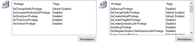 Securitytab and checking the box at the bottom of the window. If you see more than something like five basic privileges listed, the process is likely running with elevated privileges. Image 2 shows a comparison between the permissions of cmd.exe running as a regular user (left) andsmartcontrol.exe, which always runs with administrator privileges (right).