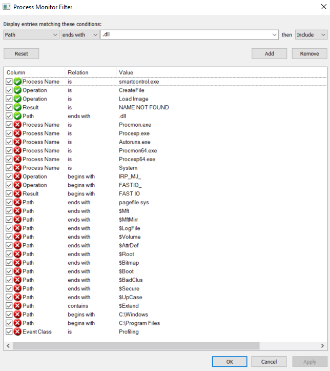 The two images below show the filters I set when analyzing smartcontrol.exe and the resulting output.
