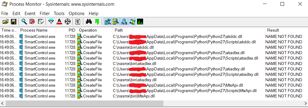 Looking at the results, we can see that SmartControl tries to call the following four DLL files from three locations that are writable by a regular user: atiddc.dll, atiadlxx.dll, atiadlxy.dll and MtxApi.dll.